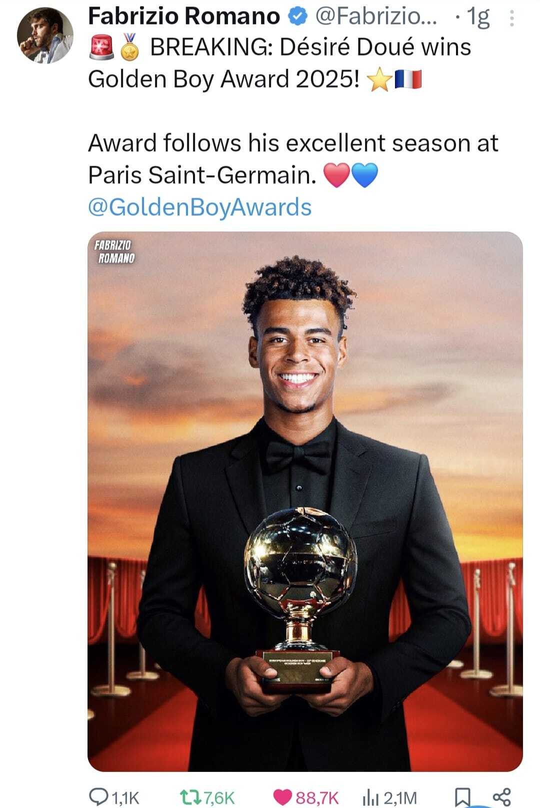 Désiré Doué was crowned the overall Golden Boy winner, while Pio Esposito from Inter received the Best Italian Golden Boy award.